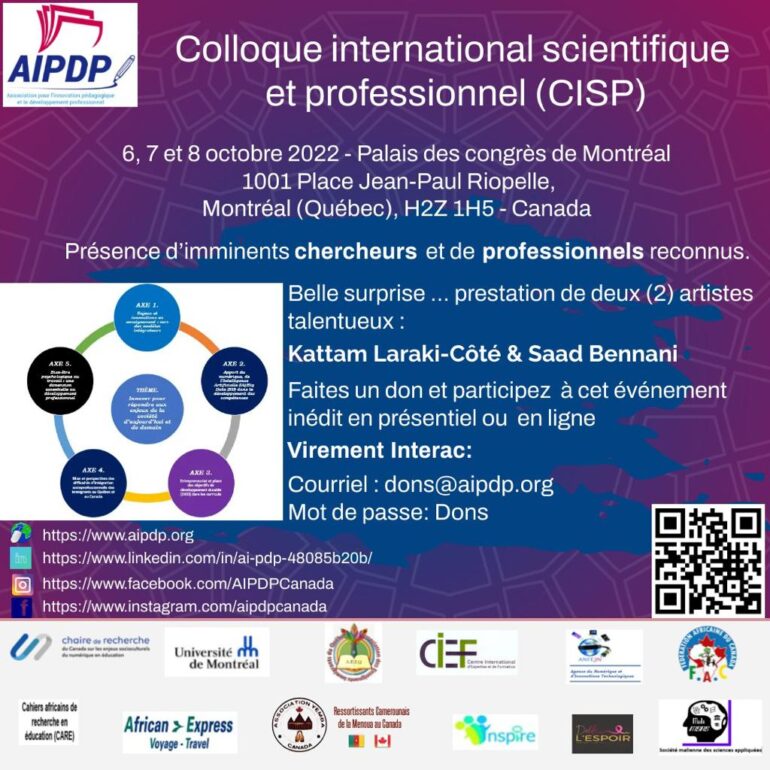 L’Association pour l’Innovation Pédagogique et le Développement professionnel (AIPDP) organise au palais des congrès de Montréal un Colloque International Scientifique et Professionnel. Le thème retenu est: « Innover pour répondre aux enjeux de la société d’aujourd’hui et de demain ».